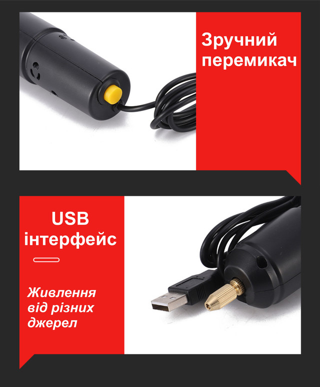 - Універсальне живлення: Наш дриль оснащений USB інтерфейсом, що дає змогу живити його від безлічі джерел. Просто підключіть його до 5В і почніть роботу. З довжиною шнура 1,8 метра у Вас буде достатньо свободи для маневру.