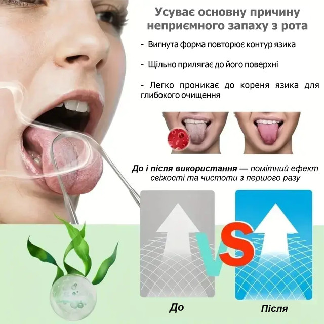 ✅ Вигнута форма — повторює анатомію язика, очищає навіть біля кореня